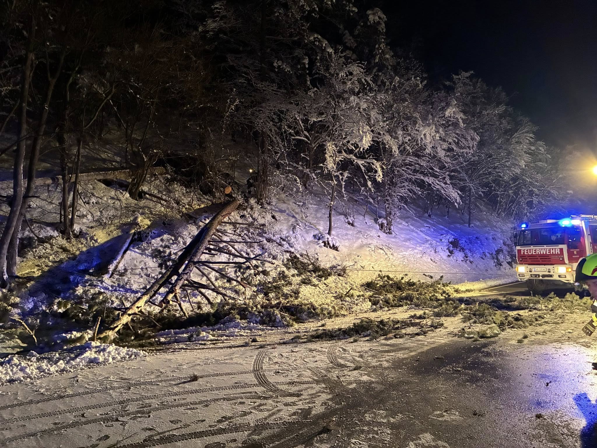 Vor Ort wurde festgestellt das die zwei größeren Bäume nicht mehr in unserem Einsatzgebiet liegen. Daher wurde ebenfalls die Freiwillige Feuerwehr Gleissenfeld alarmiert sowie die Polizei.