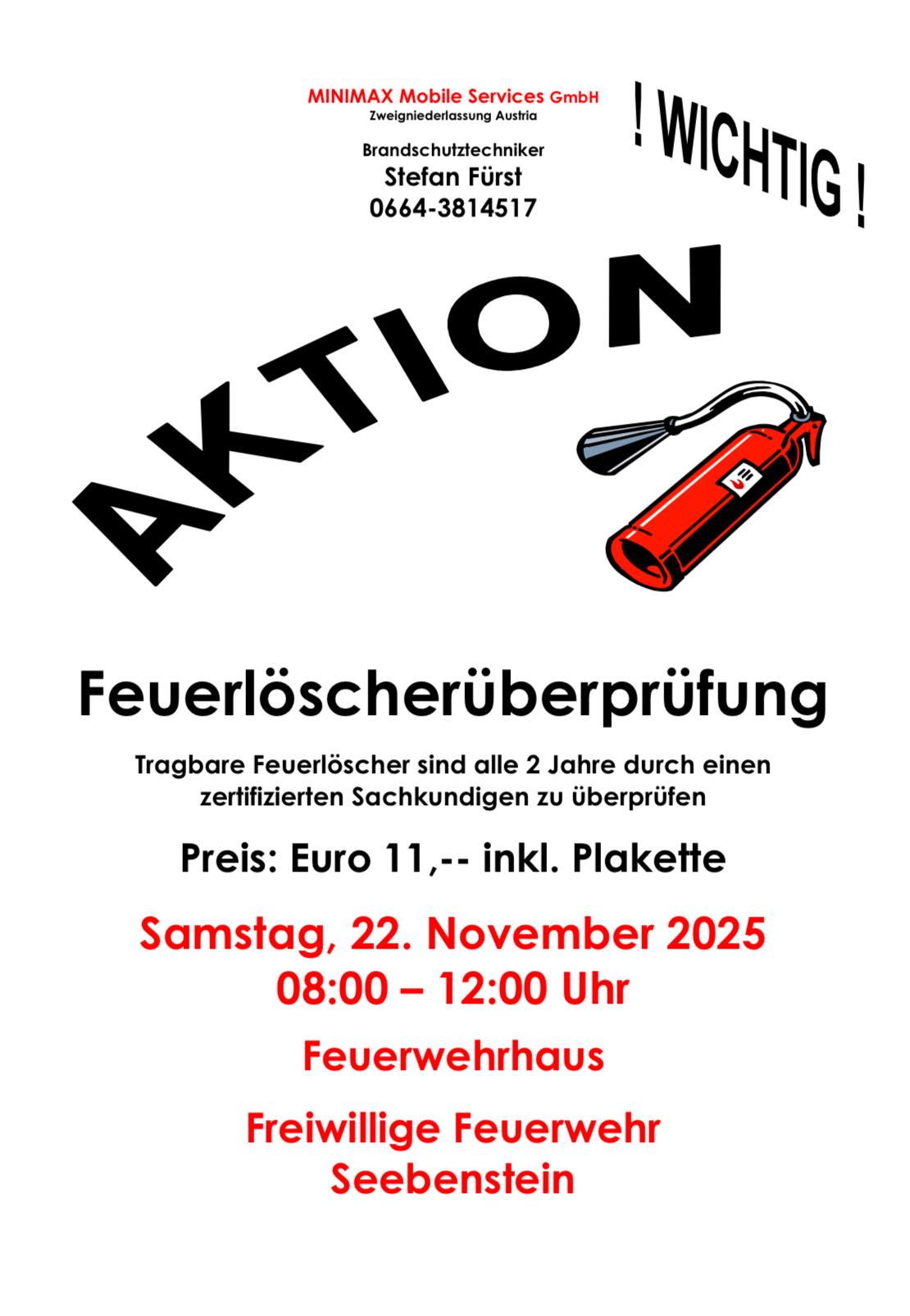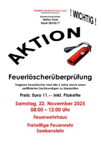Allgemein Feuerlöscher Überprüfung 18. November 2025 Max Reimann Am Samstag den 22.11.2025 von 8-12 Uhr gibt es wieder die Möglichkeit im Feuerwehrhaus die Feuerlöscher prüfen zu lassen.